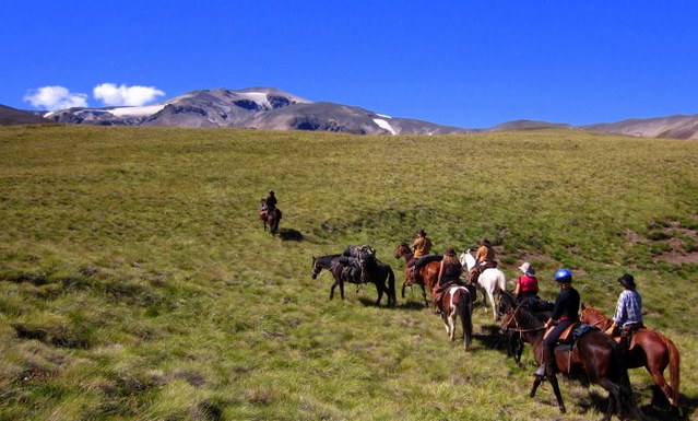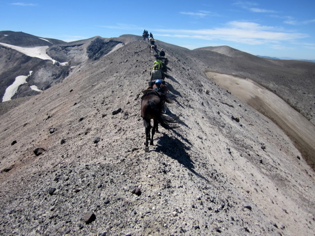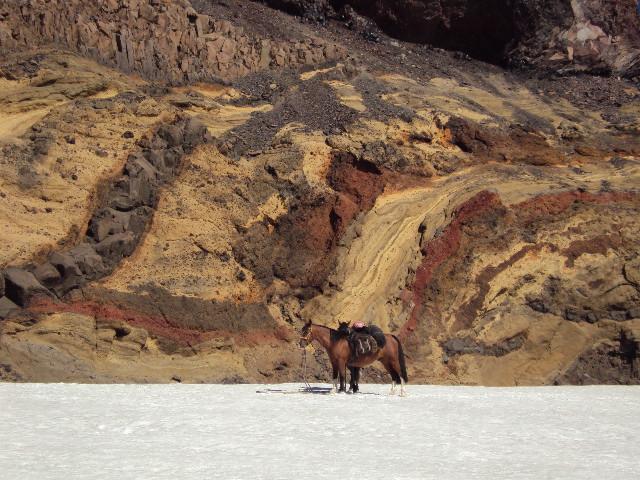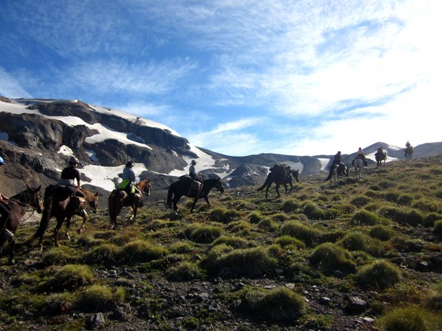Sollipulli Volcano is a 2200 meter / 7220 feet high Vulcano north of Huerquehue National Park. It's considerd sleeping, means not active but either dead. The crater has a diameter of 4 kilometers / 13000 feet and is filled with a glacier 600 meter / 2000 feet thick . In summer of 2011 after having explored a way up we did the first ascent on horseback. We got into the crater but could not completely cross, in March of 2012 we gave it a try, accompanied by a film team, the result is a 45 minutes documentary, broadcasted several times on german tv.